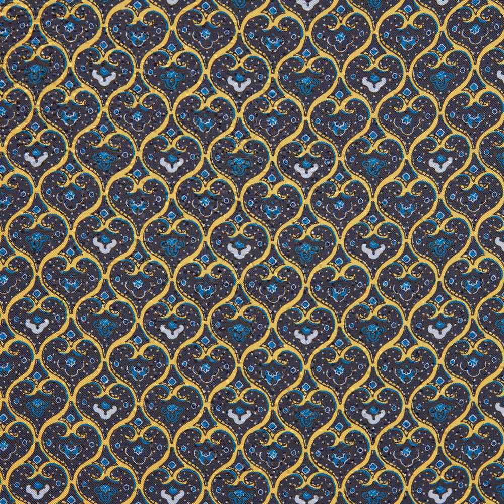 ロマンチックな人向けの、この複雑な模様のシルク ポケット チーフは、イエロー、フォレスト グリーン、ネイビーの繊細なハート型プリントが特徴です。