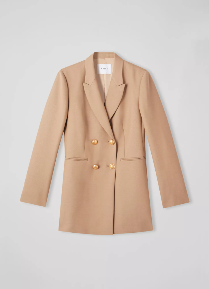 ポルトガルで、万能なキャメル生地を用いて仕立てられたこのジャケットは、ダブルブレストスタイルで、クレストスタイルのゴールドボタン、ピークドラペル、フロントのウェルトポケット、そして美しいカットが特徴です。