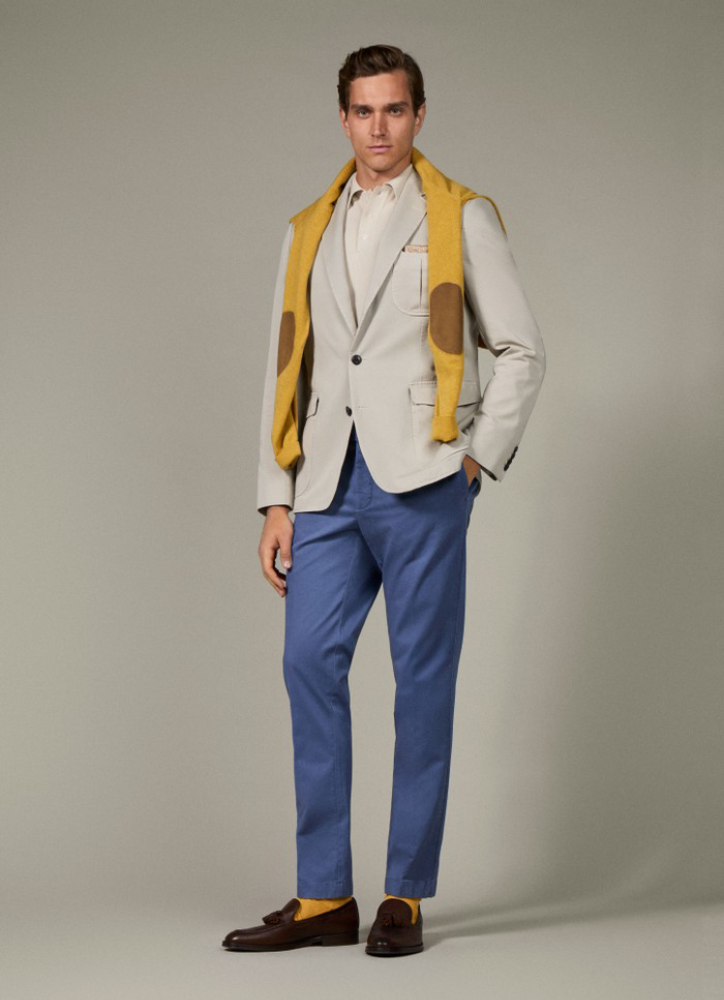 上品な仕上がりの同系色のフェイクスエードのエルボーパッチが特徴的です。