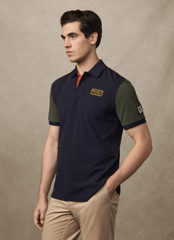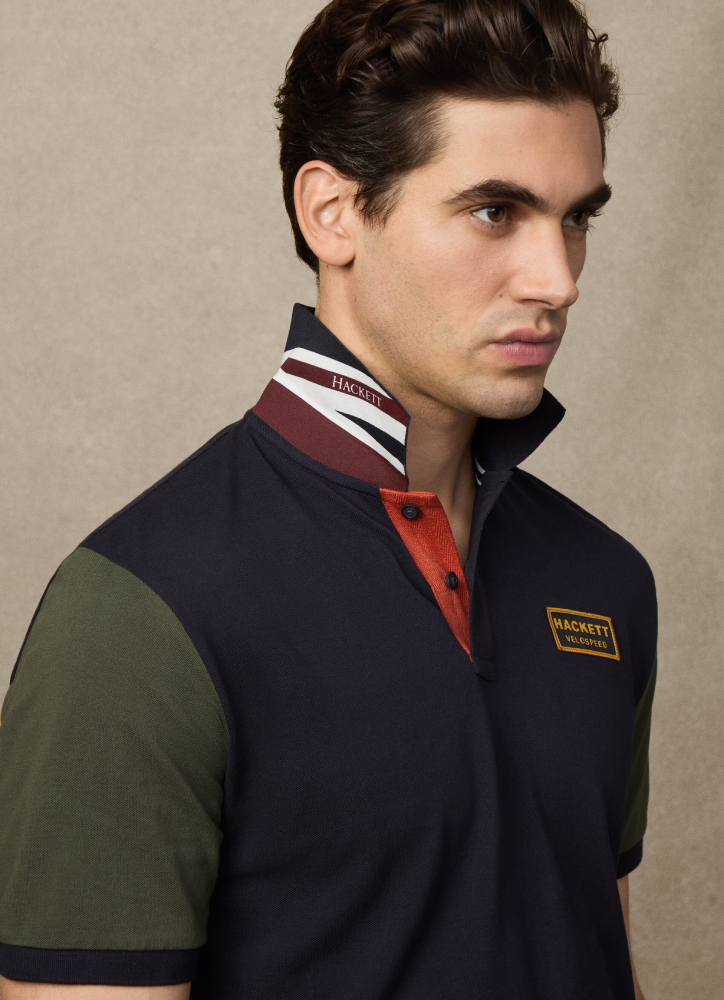 アーカイブVelospeedパッチブランドと襟下のフラッグプリントが大胆なタッチをプラスしています。