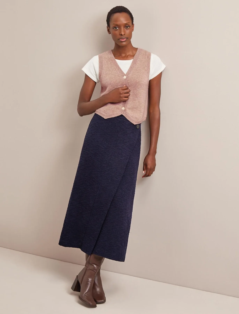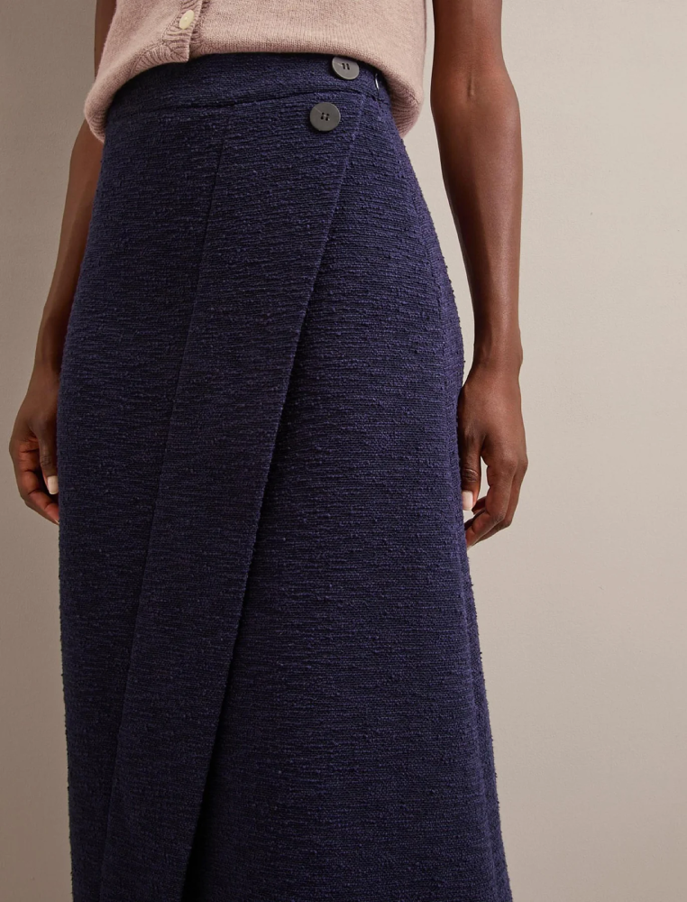 豊かな質感のブークレツイード素材で、裾がはみ出さないラップ仕様。